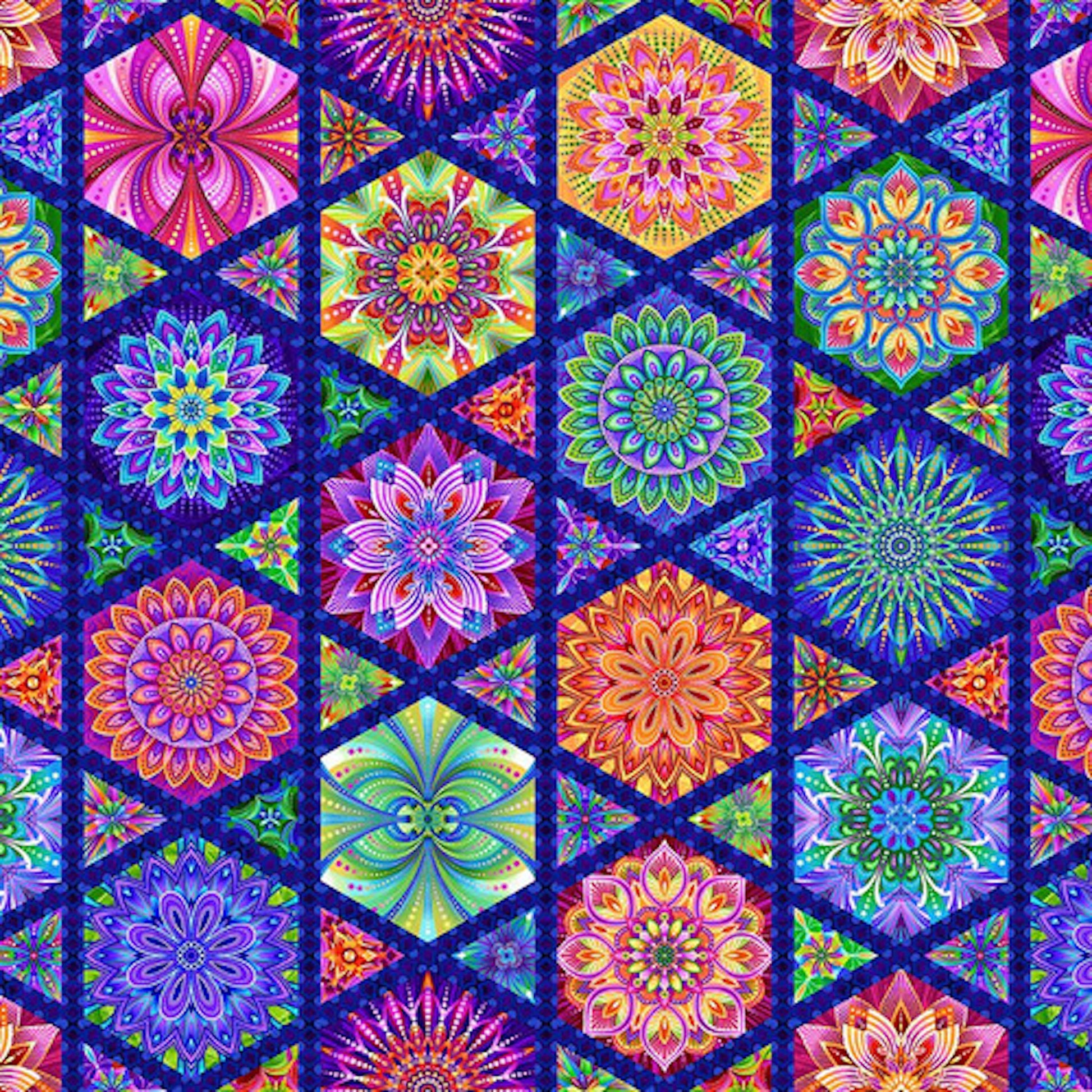 Caravan- Royal Multi Hexi Medallions: Sold by the 1/2 yard.