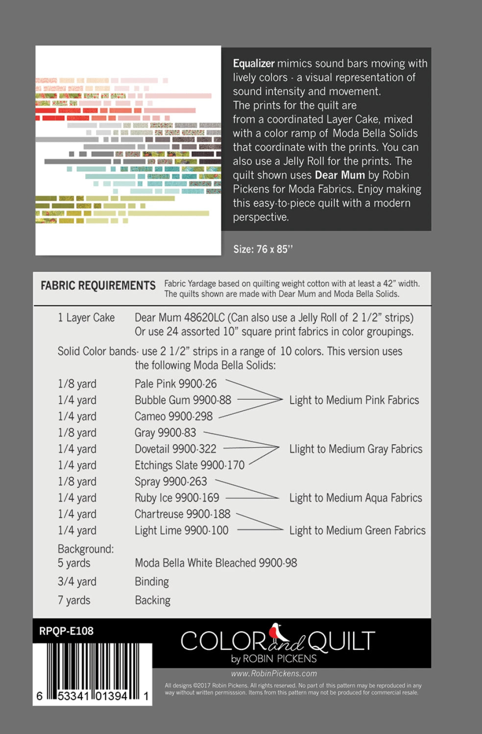 Equalizer pattern mimics sound bars moving with lively colors in this modern quilt. Pattern uses a Layer Cake mixed with solids that compliment the prints and solid background yardage. Quilt measures 76in x 85in. Easy to piece.