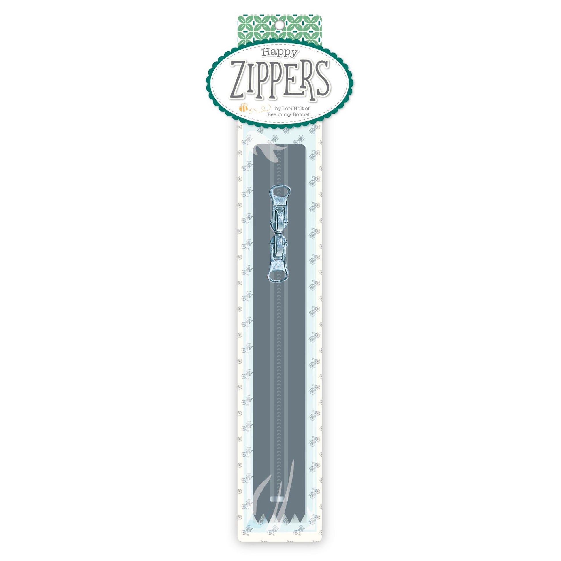 This 16" Happy Zipper by Lori Holt of Bee in my Bonnet comes individually packaged. The zipper is 1" x 16" and has 2 zipper pulls. The Happy Zippers have polyester fabric tape, zinc alloy sliders and pulls, and nylon teeth.