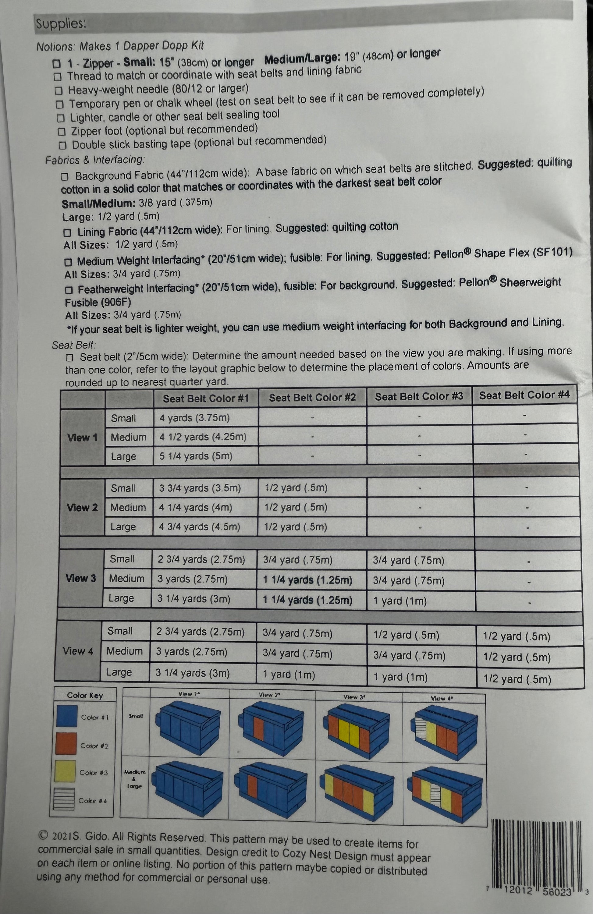 Stitch up a seat belt Dapper Dopp Kit! This kit contains the pattern and seat belt webbing - just add fabric, interfacing and zipper. Seat belt webbing is extremely durable, easy to clean, and easy to sew on a home machine. The Dapper Dopp Kit makes this classic dopp kit for the special guy (or gal!) in your life. It’s the perfect gift for husband, boyfriend, groomsmen, travelers – well, just about everybody! The Dapper Dopp Kit is a timeless design that has a roomy interior for all those daily grooming products and a fully zipped top to keep them secure. The pull tabs and a side handle make for easy opening and carrying. This kit makes a large size bag that measures 10 x 6 1/2 x 3 1/2” (25x17x9cm) in Dark Blue and Steel Blue . Skill level: Intermediate.