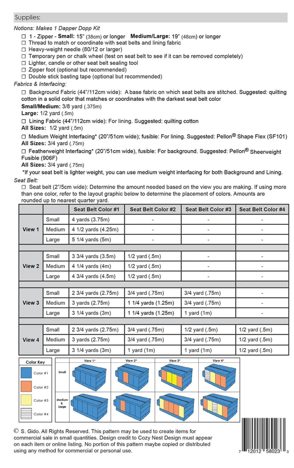 titch up a seat belt Dapper Dopp Kit! This kit contains the pattern and seat belt webbing - just add fabric, interfacing and zipper. Seat belt webbing is extremely durable, easy to clean, and easy to sew on a home machine. The Dapper Dopp Kit makes this classic dopp kit for the special guy (or gal!) in your life. It’s the perfect gift for husband, boyfriend, groomsmen, travelers – well, just about everybody! The Dapper Dopp Kit is a timeless design that has a roomy interior for all those daily grooming products and a fully zipped top to keep them secure. The pull tabs and a side handle make for easy opening and carrying. This kit makes a large size bag that measures 10 x 6 1/2 x 3 1/2” (25x17x9cm) in Dark Grey and Steel Blue . Skill level: Intermediate.