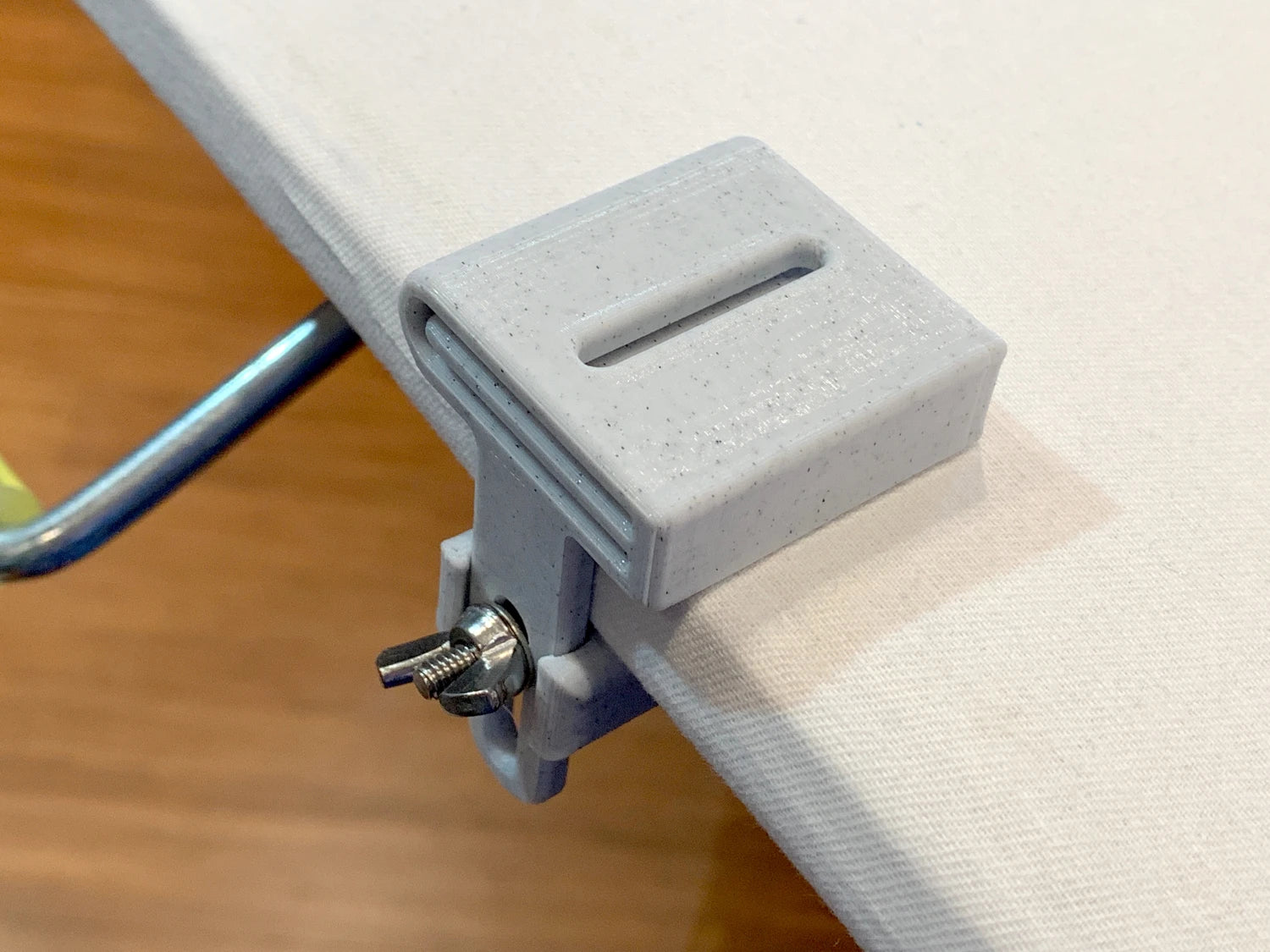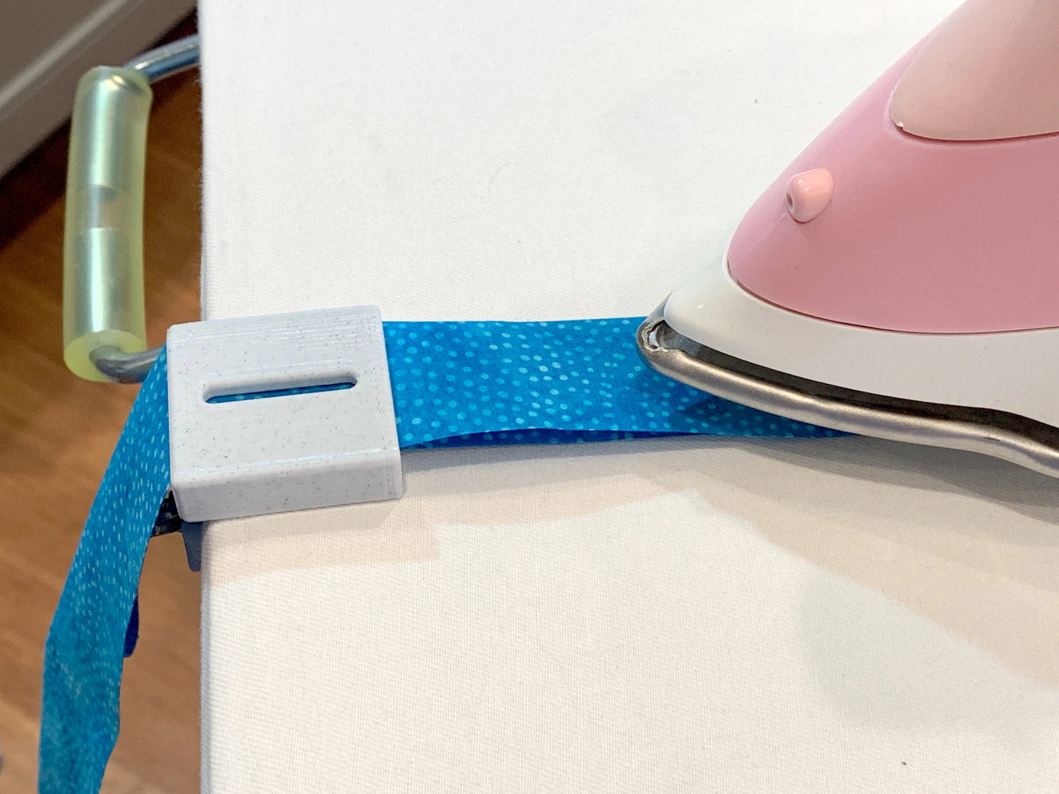 Making binding is easy with the 3rd Hand Binding Clip. It is adjustable so it fits a standard ironing board as well as thinner boards. No tools necessary, just loosen the wing nut, slide the 3rd Hand Binding Folder Clip into place and turn the wing nut to secure it in place.