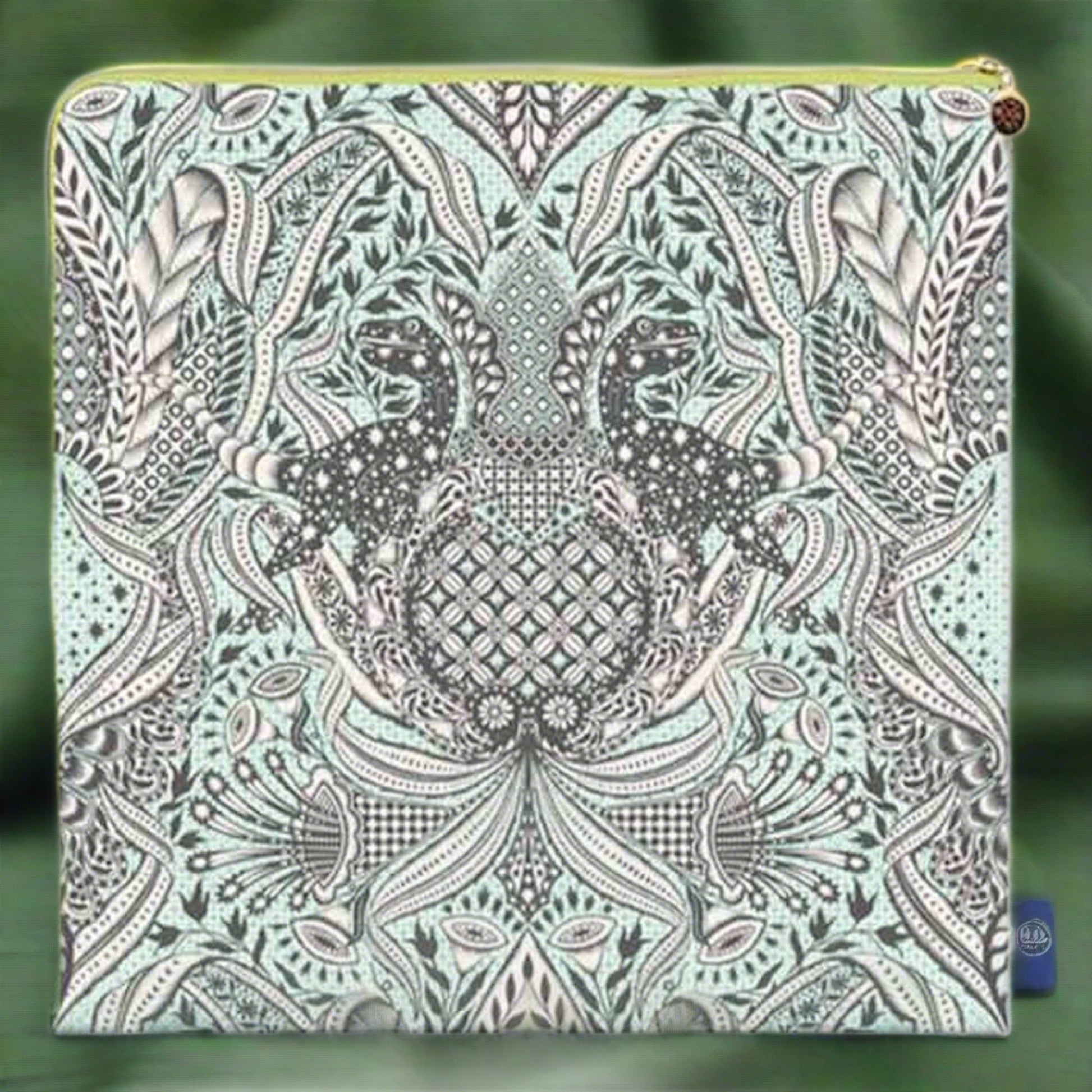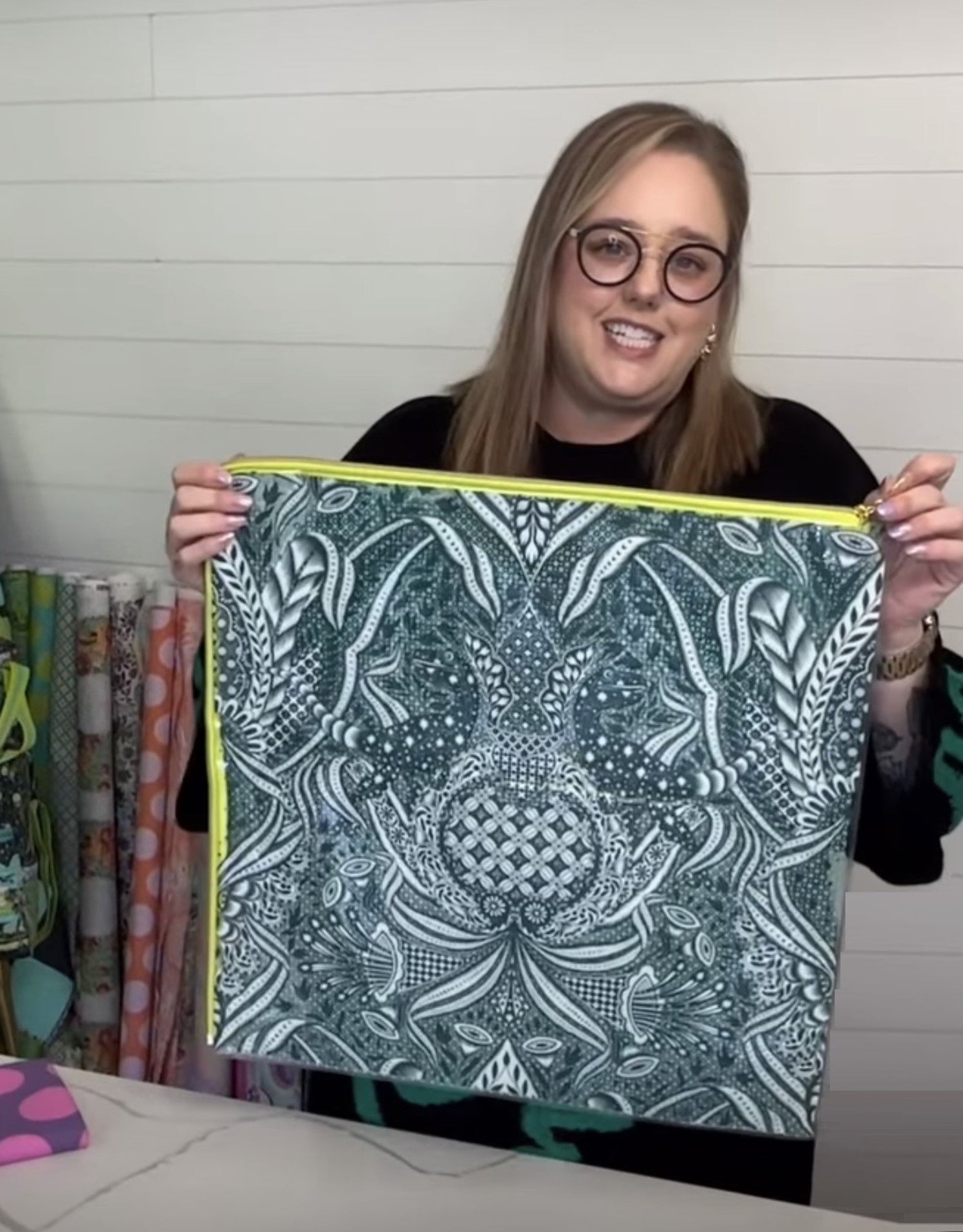 The Tula Pink Gift Rapt XL Corner Zip Project Bag is a new size bag that measures at 20in x 20in with a corner zipper on the top and side.